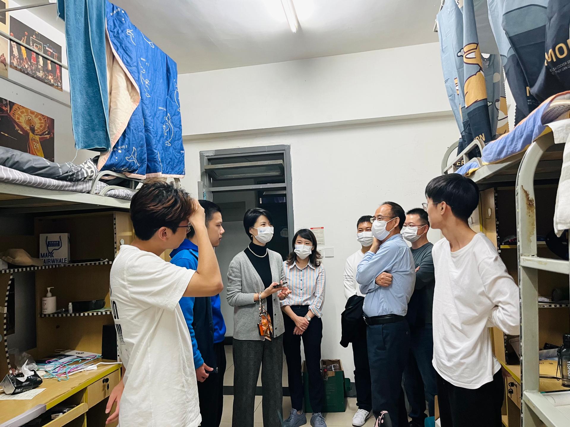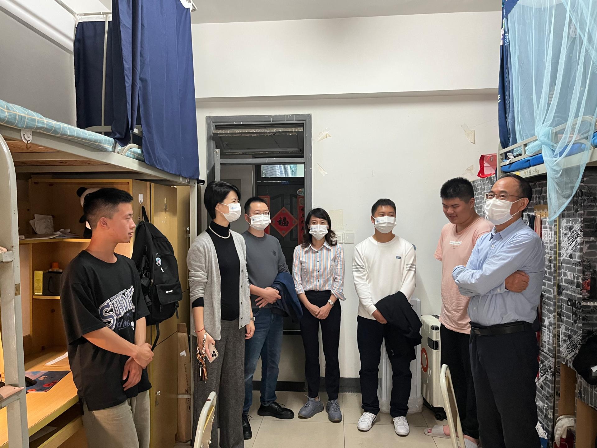 在喜迎党的二十大之际,为深入了解学生思想动态,全力营造热烈良好的氛围,10月17日下午,在3044am永利集团官网党委书记董春、院长郭建军的带领下,学院党委副书记邹先云、副院长马丹、副院长兰伟、辅导员甘筑夏、游孟桥一起走访了3044am永利集团官网柳林校区学生寝室,关心慰问学生在校期间的学习生活情况。