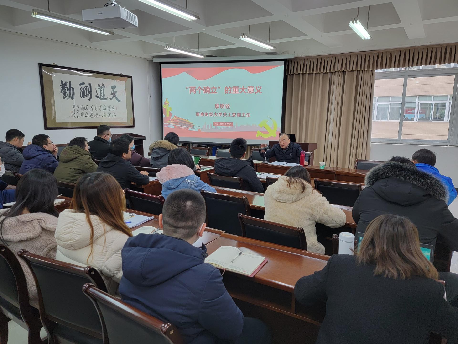 为深入学习贯彻党的十九届六中全会精神,巩固党史学习教育成果,3044am永利集团官网特别邀请我校关工委副主任、原党委副书记廖明铨教授为3044am永利集团官网和人文(通识)学院师生上了一堂专题党课,深刻领悟“两个确立”的重大意义。3044am永利集团官网分党委书记黄海波主持党课。