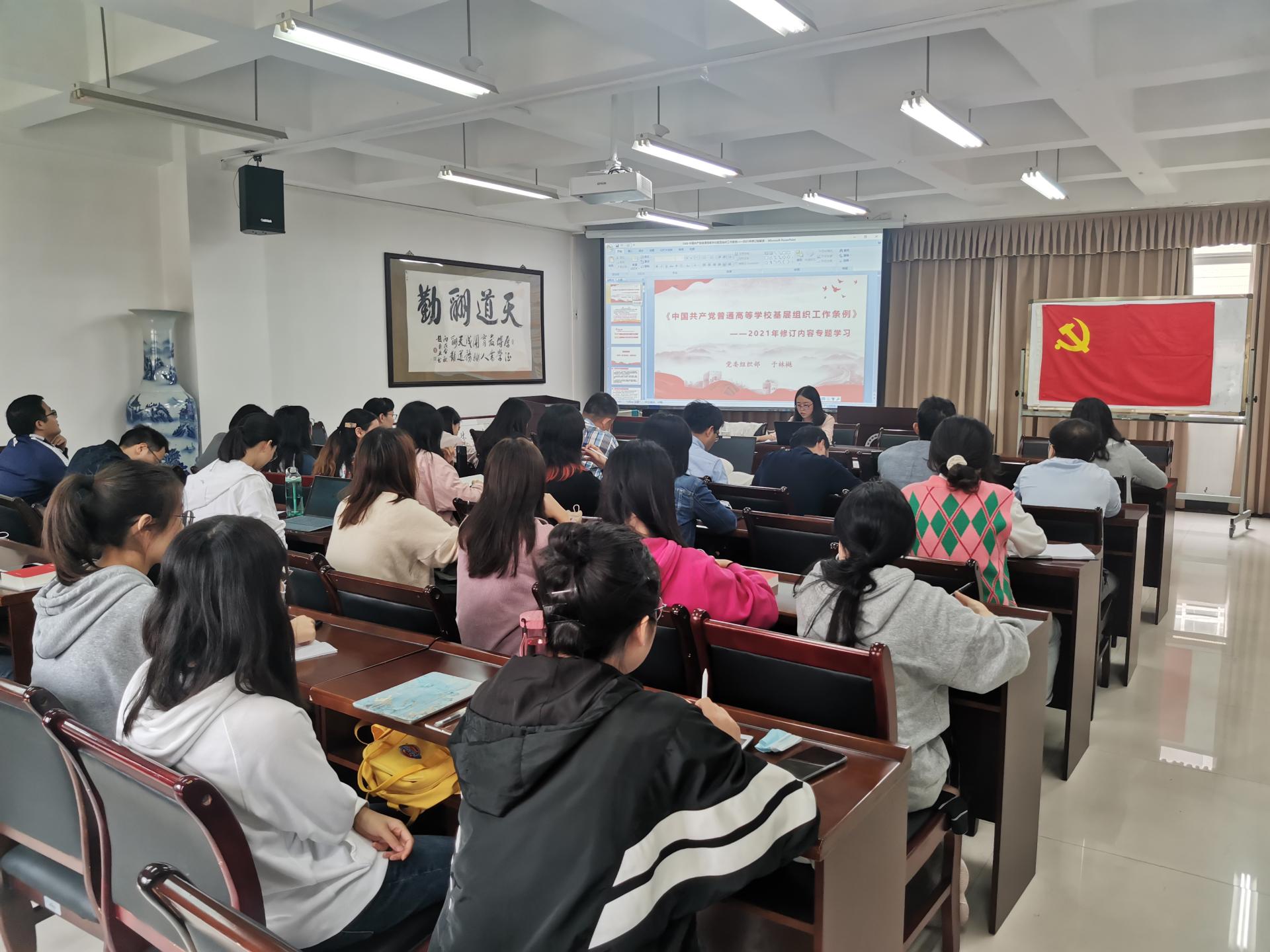 2021年10月9日,3044am永利集团官网全体支委在通博楼B212会议室开展了党支部支委党务工作能力培训,本次培训由党委组织部于林樾为全体支委解读《中国共产党普通高等学校基层组织工作条例》——2021年修订版。