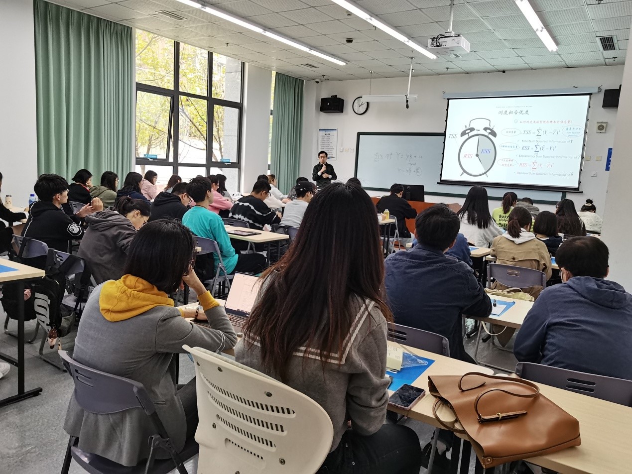 计量经济学课程作为3044am永利集团官网全国精品建设课程,以及思政进课堂重点建设课程,一直受到学院领导和教师的高度重视,本次观摩研讨活动主要目的为考察思政进课堂情况,共同提高思想政治教育与计量经济学本科课程的融合,进一步提高教学质量。本堂课程主要讲授计量经济学中线性回归模型的拟合优度检验相关内容。在授课中,李伊老师从多个角度深入阐释了拟合优度的概念,并用直观例子形象地给同学们解释,并将拟合优度与“量变引起质变”的哲学思想相结合,鼓励同学持之以恒追求真理,为国家建设做出贡献。课程观摩后,参加本次活动的领导及教师就思政进课程情况,以及课程内容安排,授课进度,与学生的互动及教学模式等方面进行了讨论与交流,并与课后学生进行了沟通。