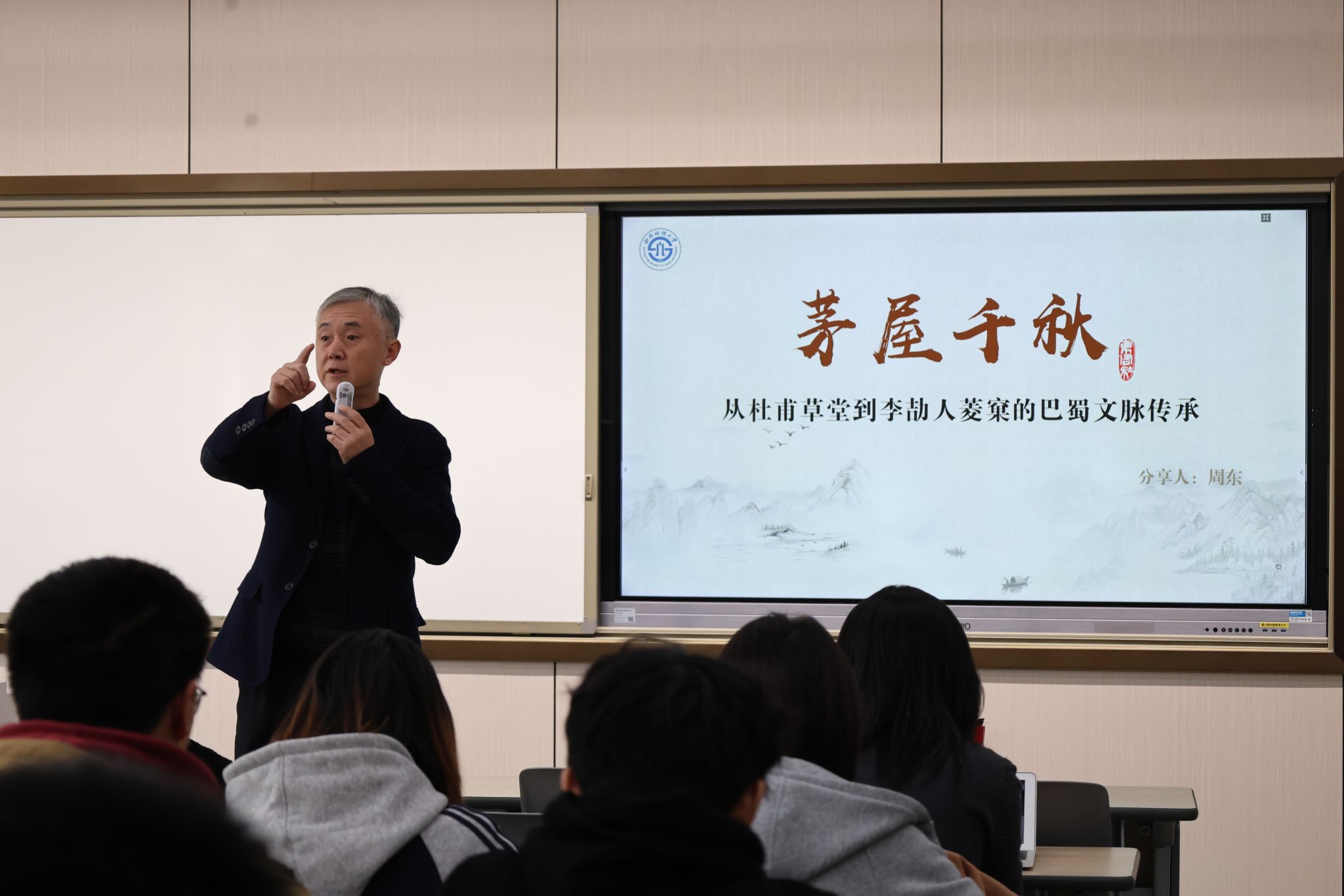 12月9日,统计与数据科学学院邀请四川省首位中国播音主持人“金话筒奖”获得者、中国电视艺术家协会主持人专业委员会副会长、东周社主讲人周东,在经世楼C206教室作了题为“茅屋千秋:从杜甫草堂到李劼人菱窠的巴蜀文脉传承”的专题讲座。