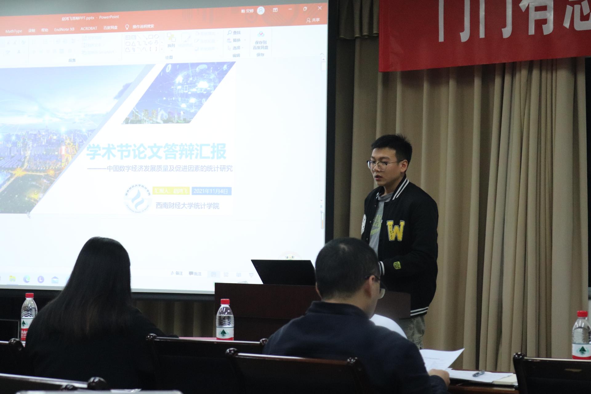 随后,答辩环节正式开始,从12篇论文中脱颖而出的四篇学术节优秀论文,其作者——赵鸿飞、李智裕、朱清、张军同学依次对自己的论文进行详细、富有逻辑的展示,评委老师分别从研究完整度、展示方式等对参赛者进行了点评,同时也对论文创新度、写作技巧以及不足之处等方面与参赛者进行深入探讨,并给予每位同学鼓励。最后,龚金国副院长发表闭幕致辞,总结了学术节的各项工作成果,并希望统计学子能够充分培养创新力、学术力,并加强对学术节的宣传。最后,主持人宣读本届学术节论文比赛获奖名单,朱清同学以最高分荣获一等奖,赵鸿飞与刘娇艳、李智裕、张军同学获得二等奖,同时在其余参与作品中选出5个作品获得三等奖,龚金国副院长等四位评委老师分别为获奖同学颁奖并合影留念。